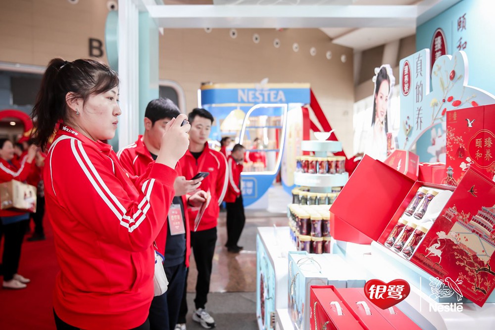 大會正式開始前,經(jīng)銷商們紛紛抵達(dá)現(xiàn)場。不同于往年,眾多新穎時尚的產(chǎn)品堆頭陳列:與頤和園IP合作的臻養(yǎng)粥古風(fēng)禮盒,雀巢咖啡世界咖啡系列等等新品,吸引經(jīng)銷商們和業(yè)務(wù)團(tuán)隊競相拍照、品嘗產(chǎn)品,現(xiàn)場氛圍火爆。本次大會最引人注目的是火紅色經(jīng)銷商服上的“贏”字,展現(xiàn)了此次大會的信心與決心。